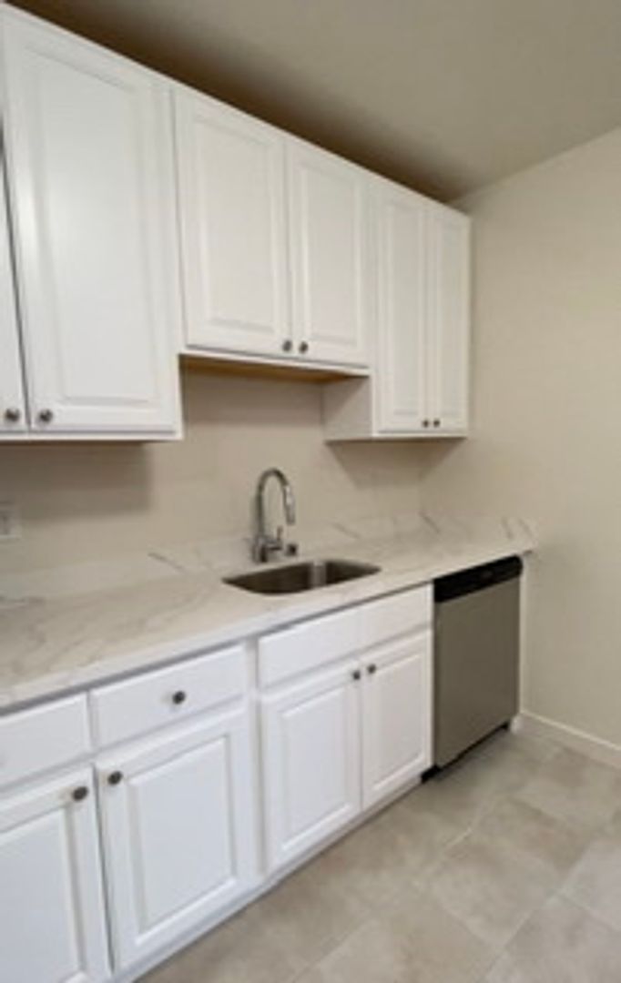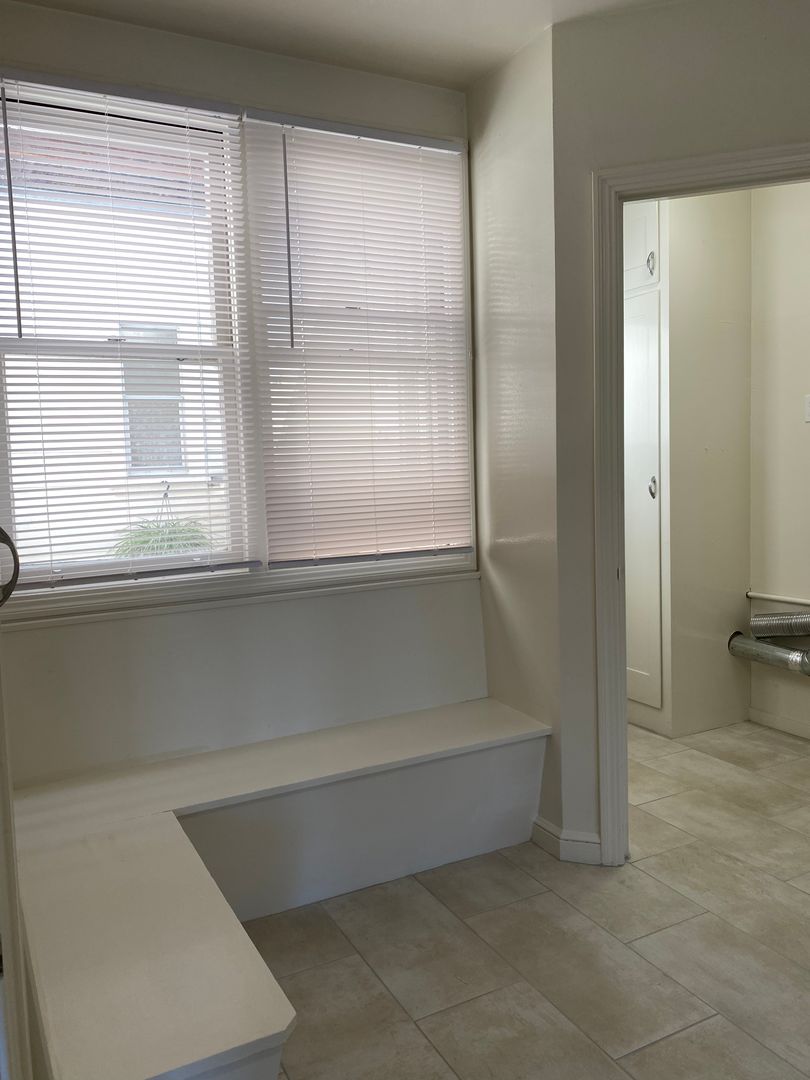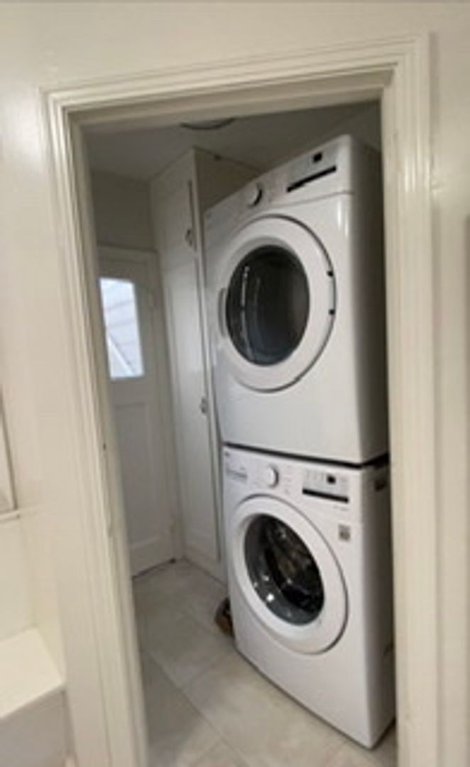 Sunny and bright top floor flat with updated kitchen. Enter into the inviting foyer that leads to an expansive living room with decorative fireplace. Step into the formal dining room with nice view and bright open windows. You will enjoy the open space to entertain. Arched doorways, high ceilings, and gleaming hardwood floors. Updated remodeled kitchen offers stainless appliances, dishwasher, granite counters and tile flooring, eat in kitchen with in unit-laundry attached. No lack of storage - large closets throughout. You will find two spaciously sized bedrooms, with large walk-in closets. Split bathroom with tub and separate shower stall. Great Walk Score! Owner will allow for one pet.